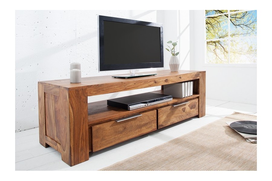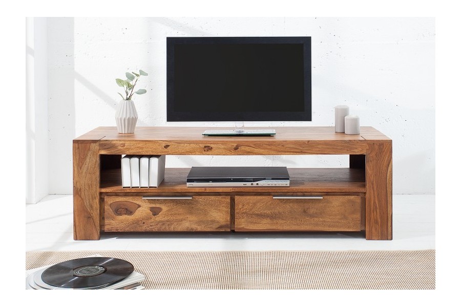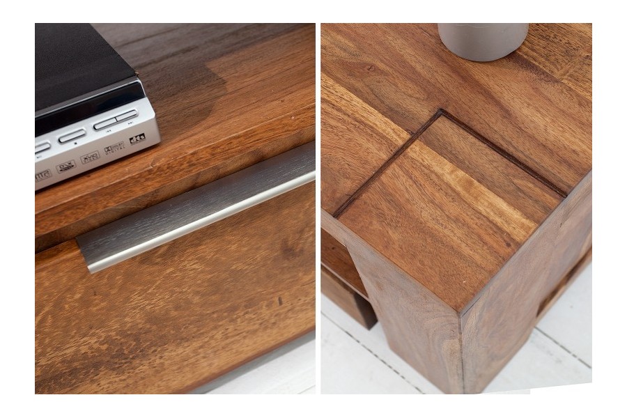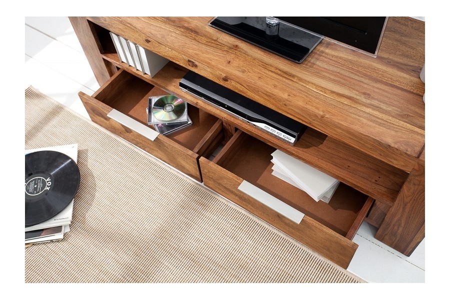 Meuble TV 100 % bois massif Sheesham, idéal pour les salons jusqu'à 55 pouces. Ses 2 tiroirs fermés rangent télécommandes, câbles et DVD, tandis que la niche centrale de 110 cm accueille votre décodeur et consoles. Coloris naturel chaud, poignées aluminium brossé. Fabrication artisanale haut de gamme.