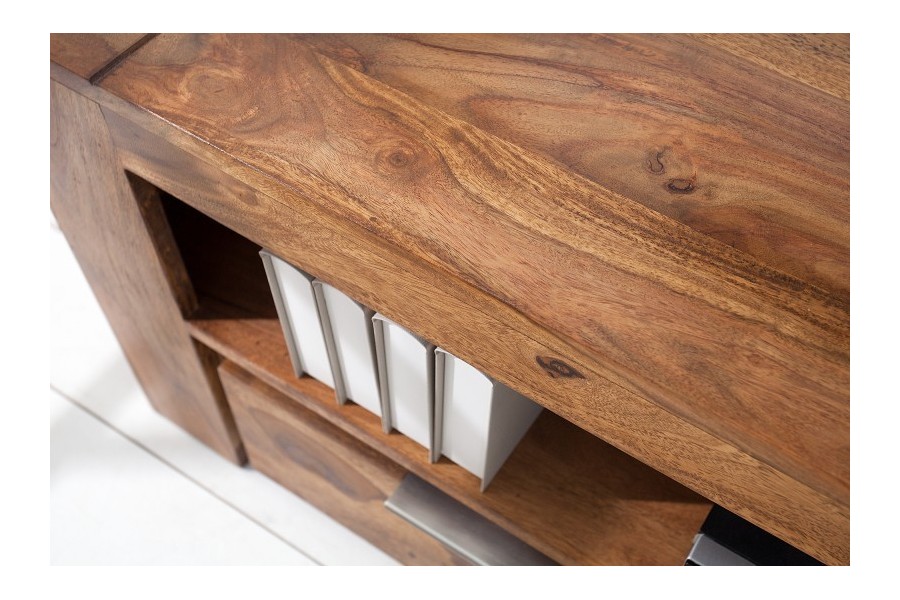 Fabriqué en bois de Sheesham massif (palissandre d'Inde), ce meuble se distingue par sa robustesse, ses veines naturelles uniques et sa teinte chaude. Chaque pièce est fabriquée à la main : de légères variations de grain ou de couleur sont inhérentes au bois naturel et font sa singularité. Les poignées en aluminium brossé apportent une touche moderne et contrastée.
