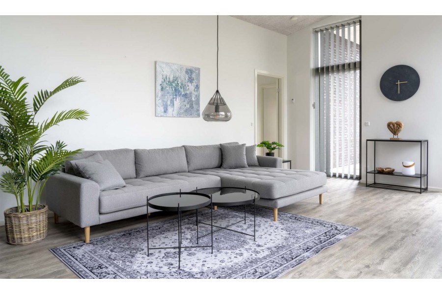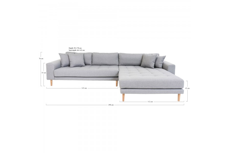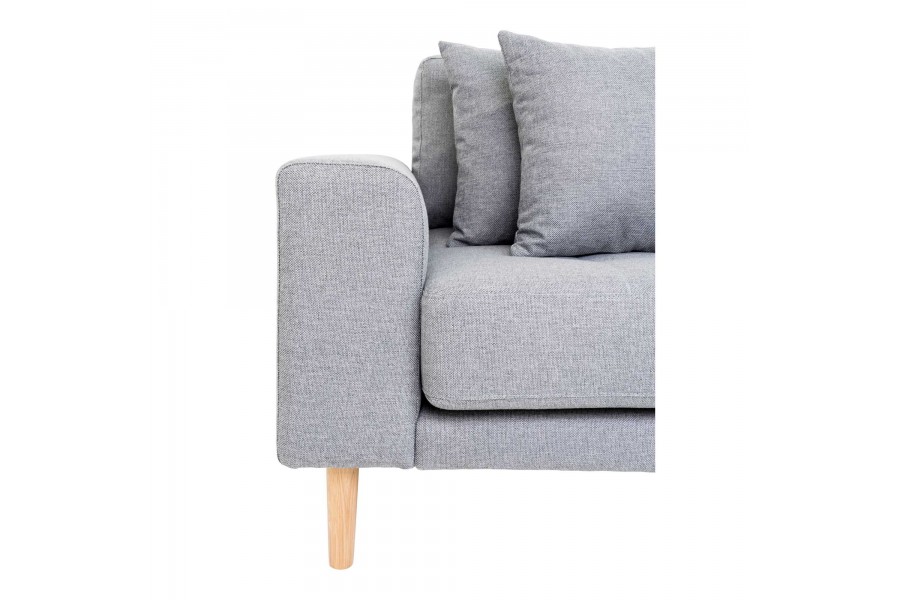 Canapé d'angle droit design coloris gris clair en tissu avec des pieds en bois naturel