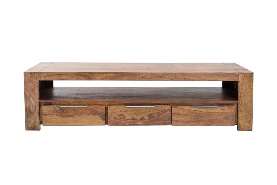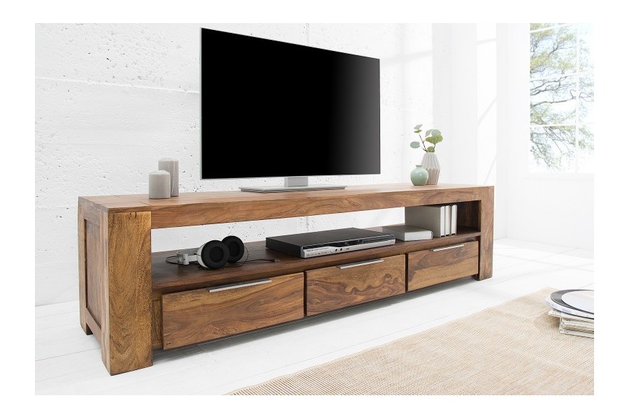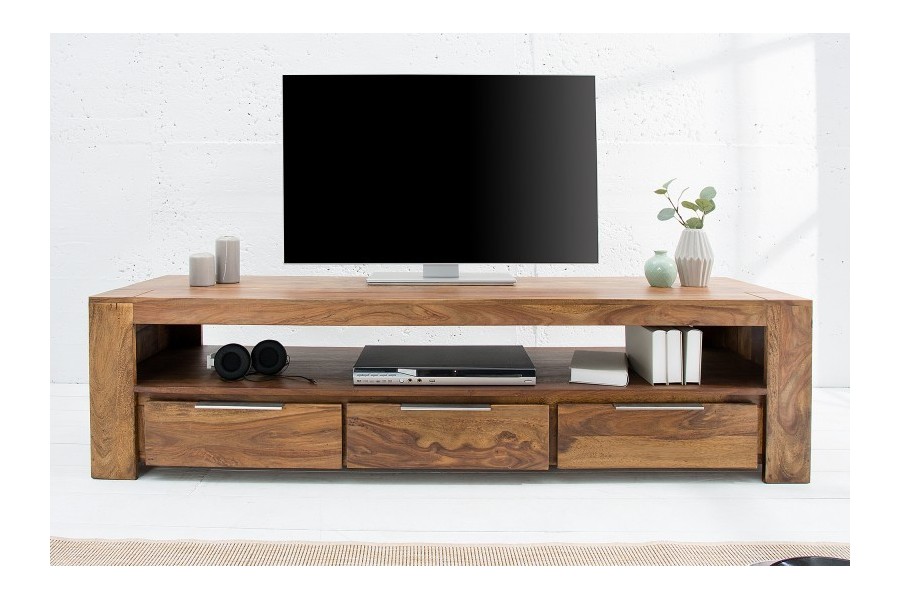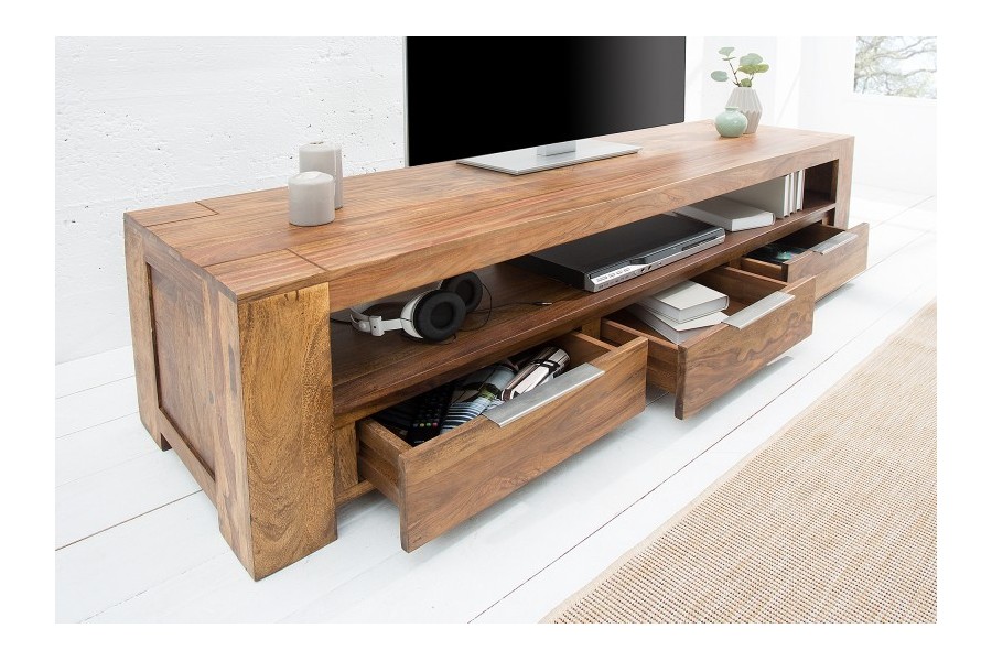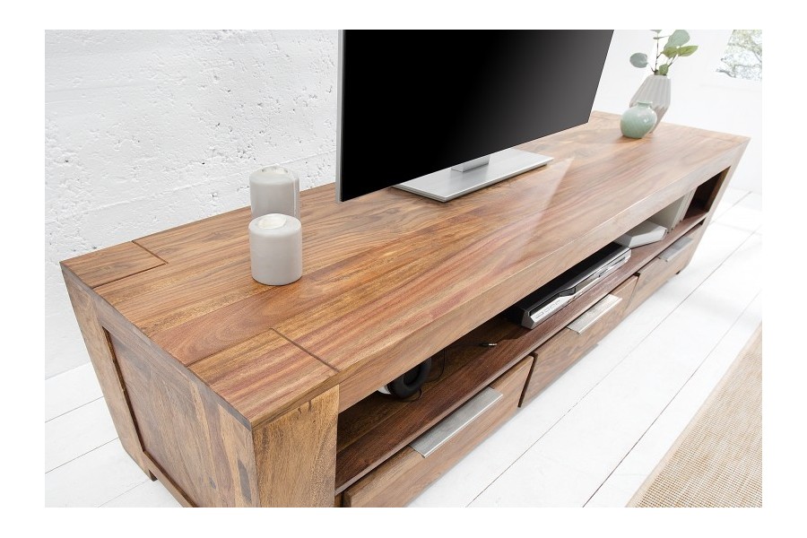 Meuble TV grand format 100 % bois massif Sheesham, conçu pour les grands salons et les TV jusqu'à 65 pouces. Ses 3 tiroirs fermés et sa niche centrale de 148 cm offrent un rangement multimédia généreux. Poignées aluminium brossé, coloris naturel chaud. Fabrication artisanale haut de gamme.