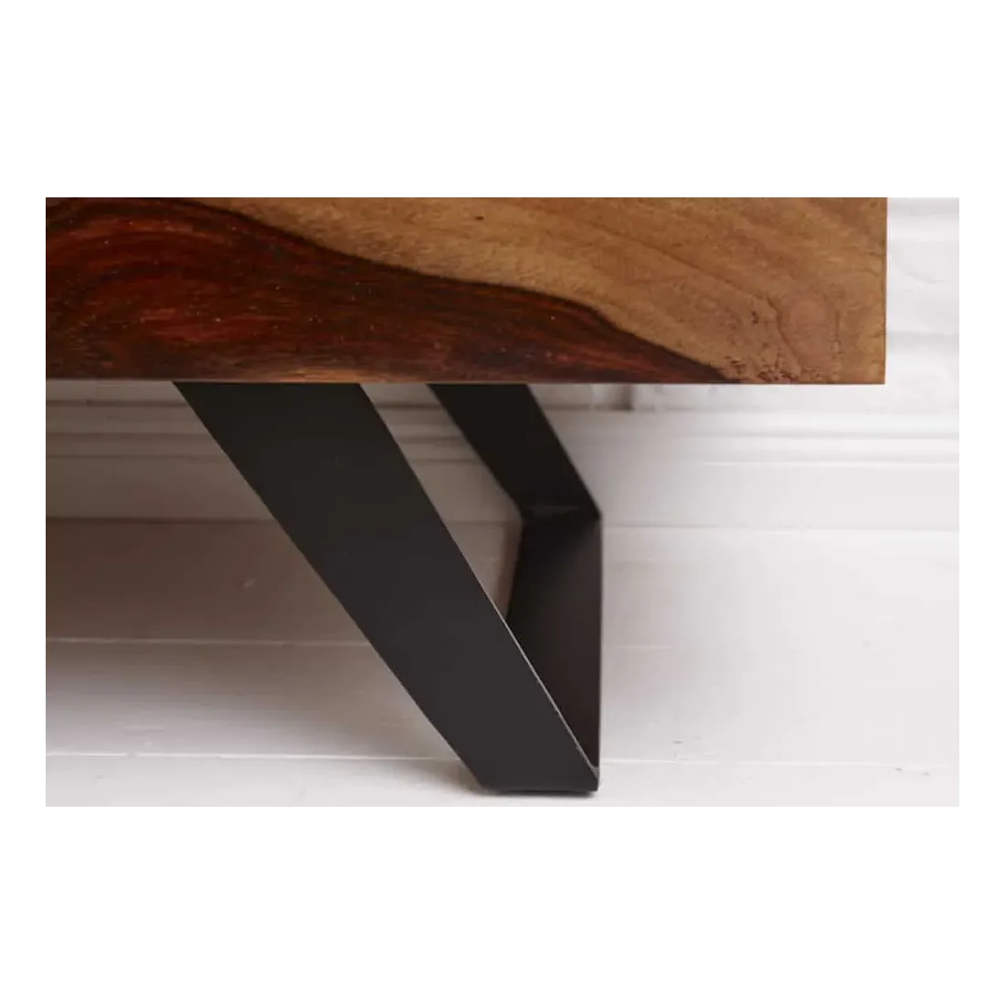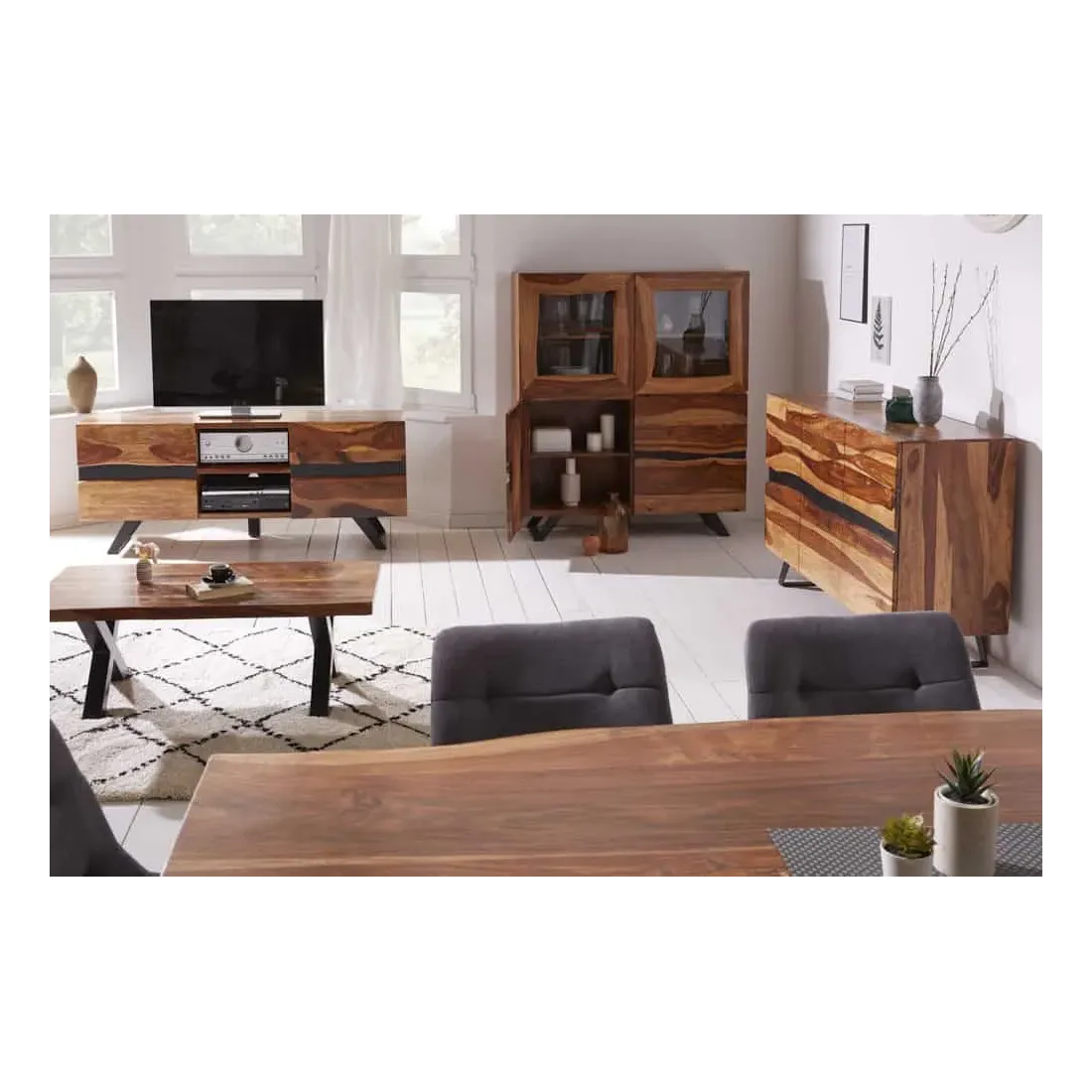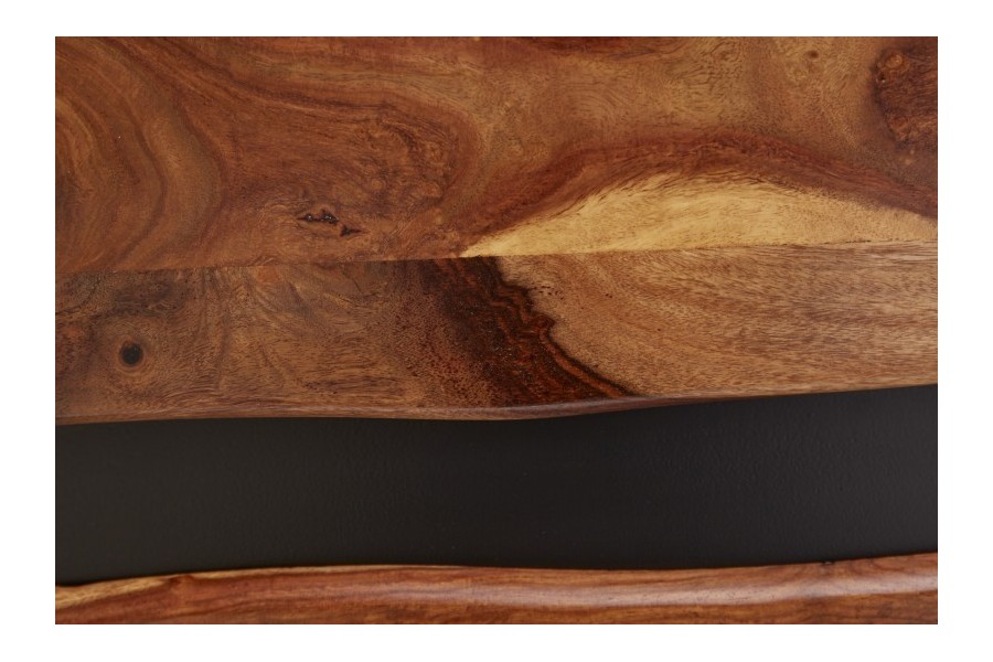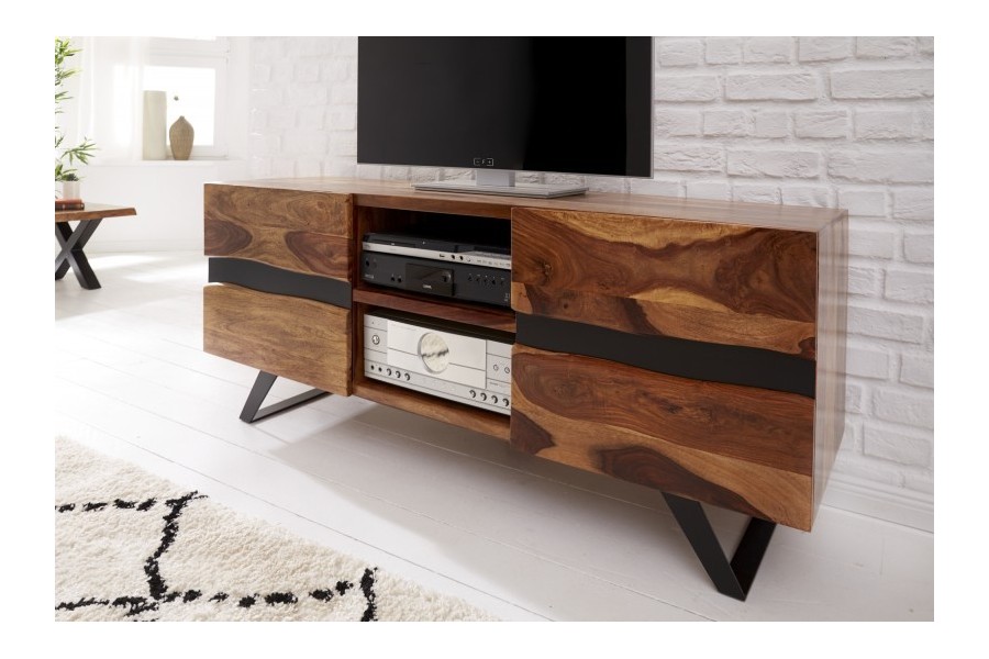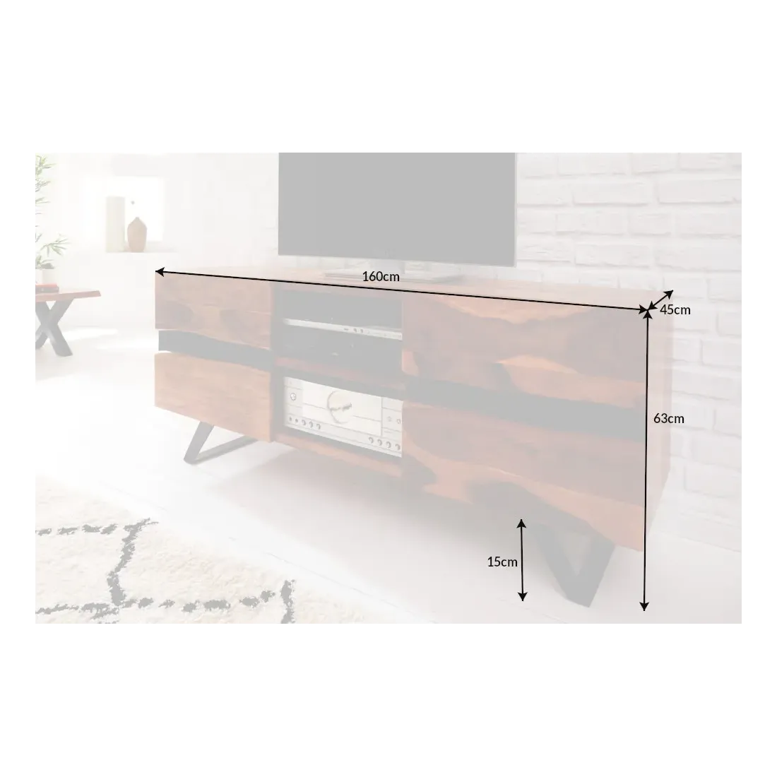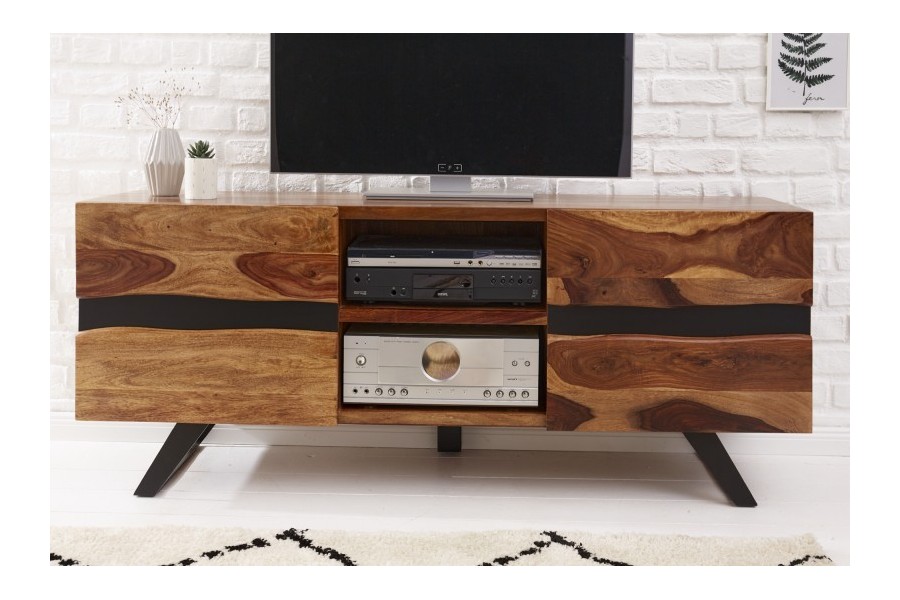 Ce meuble TV en bois massif de Sheesham (Palissandre) se distingue par son plateau avec bord d'arbre naturel , qui met en valeur la forme authentique du bois. Son style industriel associe la chaleur du bois massif et la solidité du métal noir.