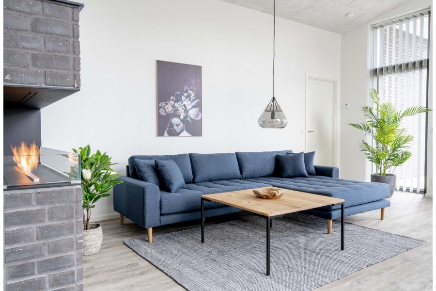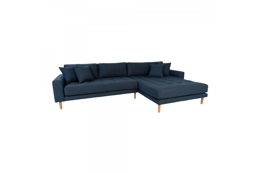 Canapé d'angle droit reversible coloris bleu foncé en tissu avec des pieds en bois naturel