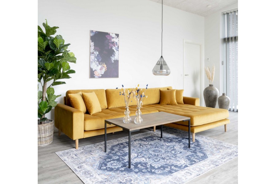 Canapé d'angle droit design en velours jaune moutarde avec des pieds en bois naturel