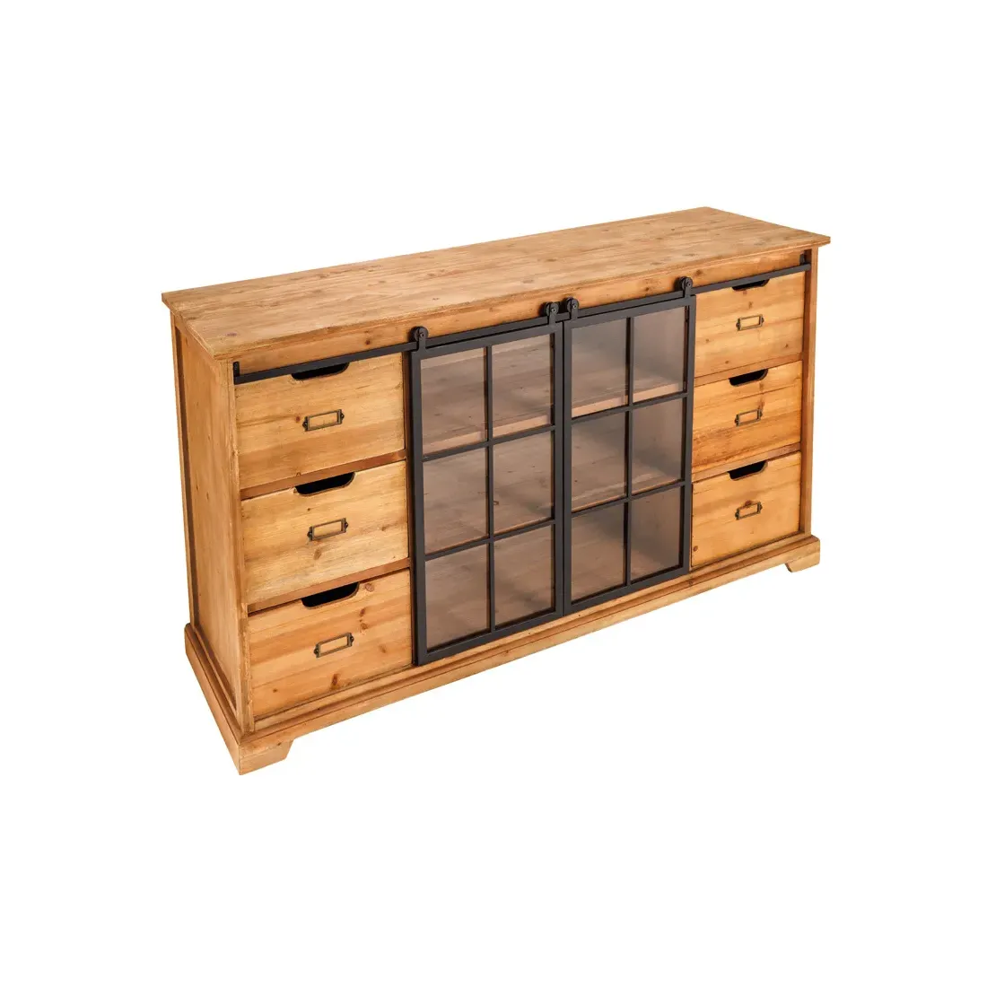 Bahut massif HENRY 150cm sapin naturel portes industrielles vitrine métal