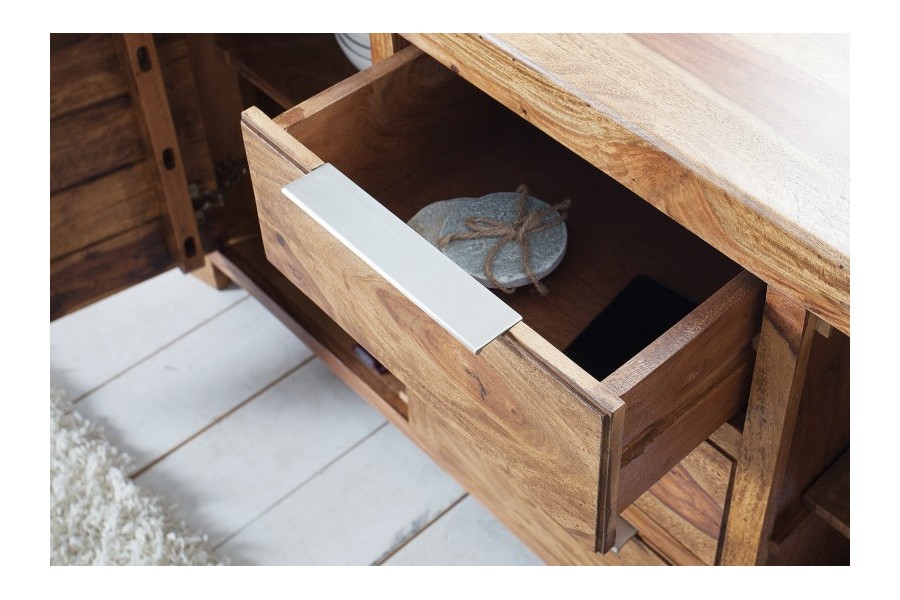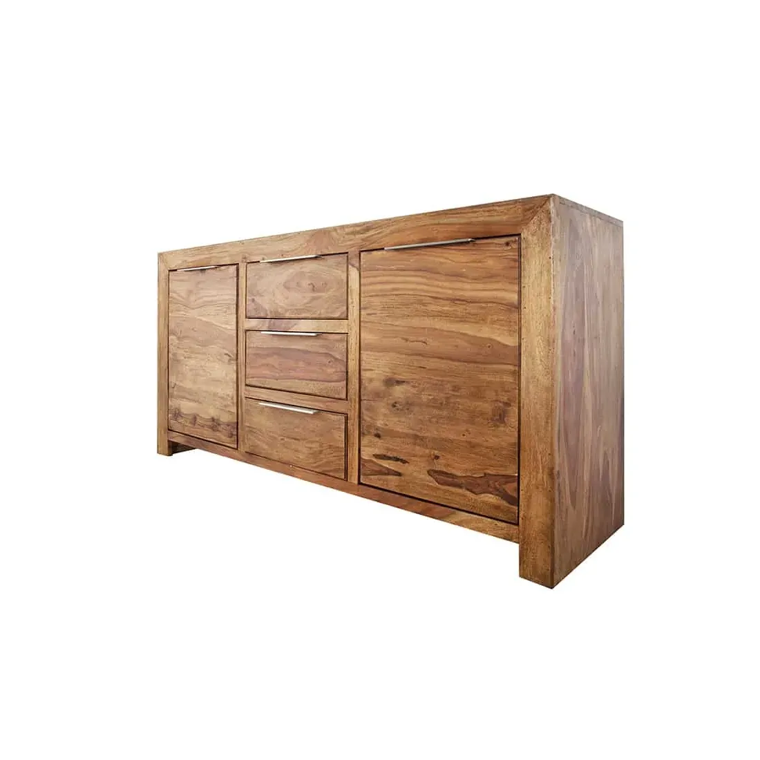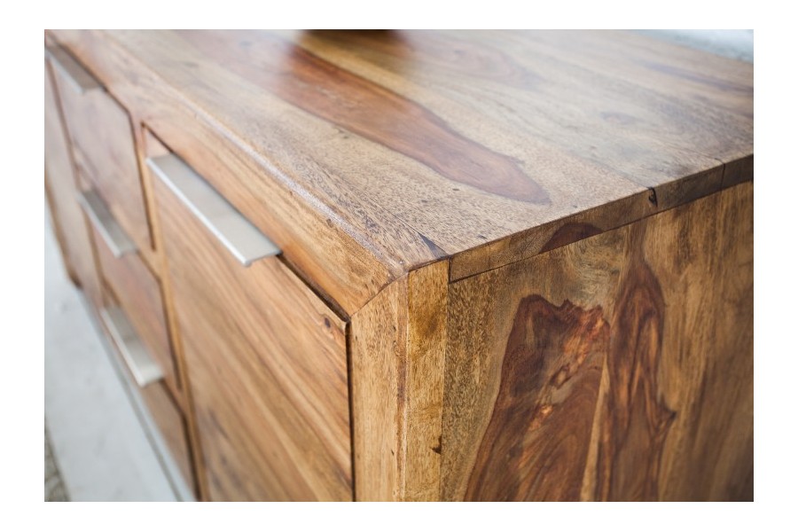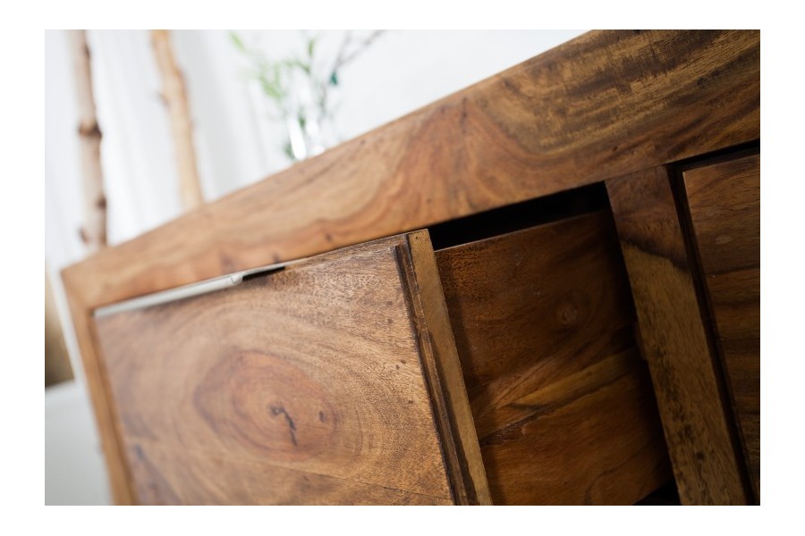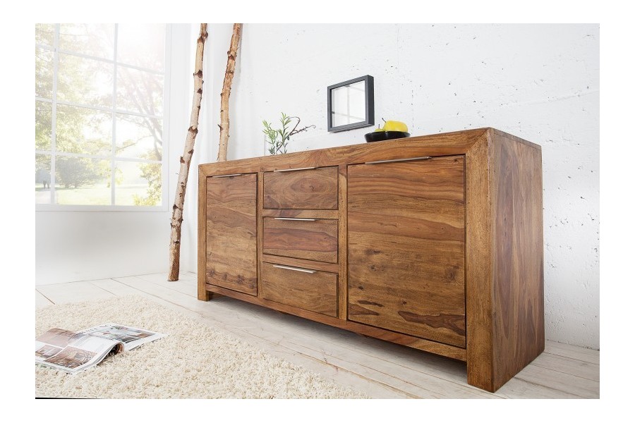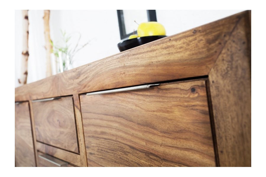 Grand buffet 100 % bois massif Sheesham coloris naturel — 180 cm de large et 80 cm de hauteur pour les grandes salles à manger et les murs larges. Ses 2 portes battantes et 3 tiroirs offrent une capacité de rangement maximale pour toute votre vaisselle et linge de table. Fabrication artisanale haut de gamme, veinage naturel unique.