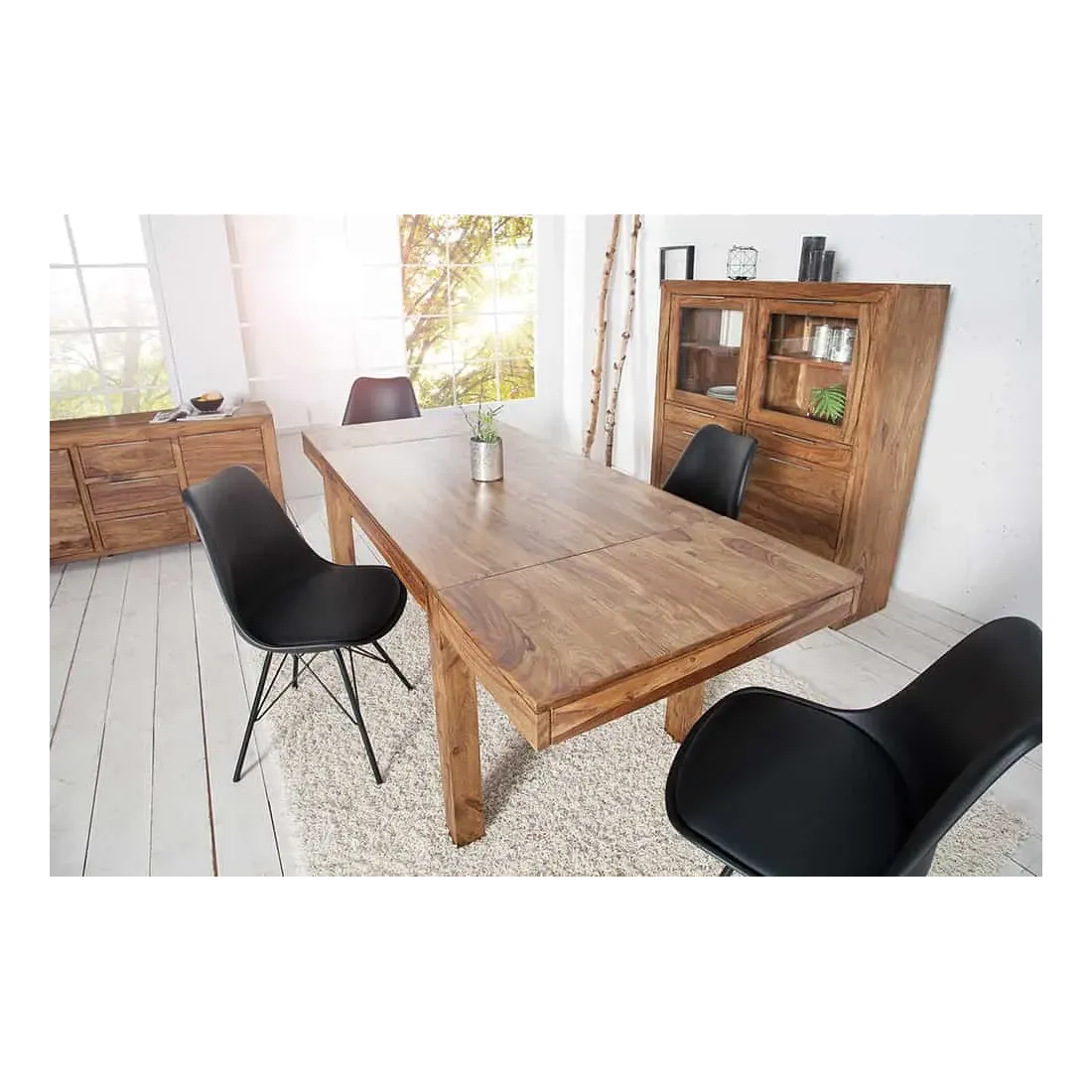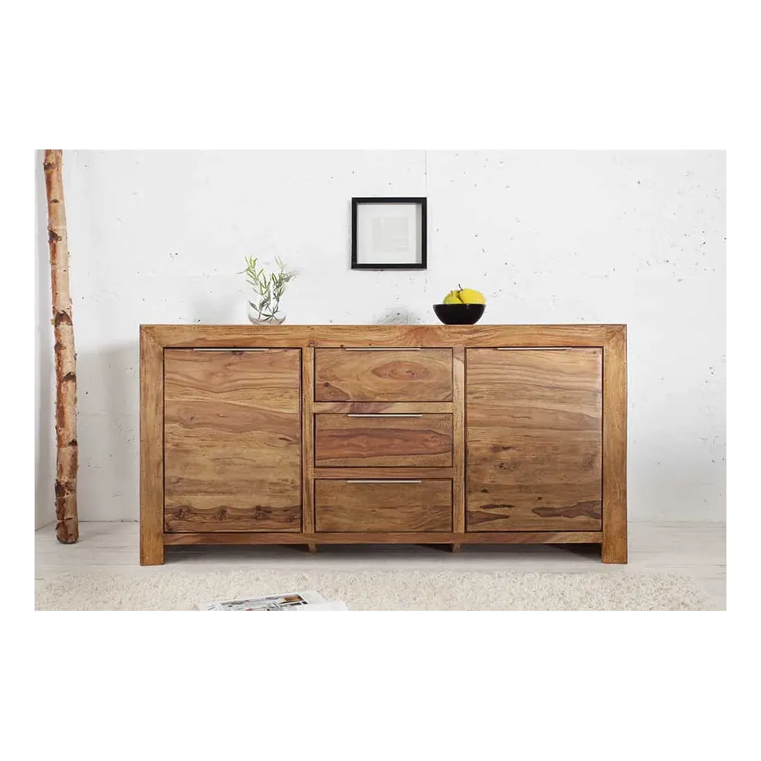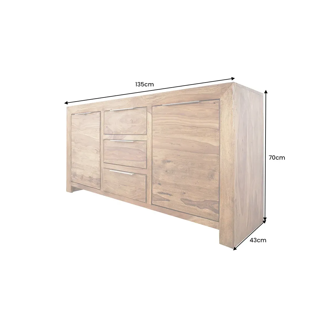 Grand buffet 100 % bois massif Sheesham coloris naturel — 180 cm de large et 80 cm de hauteur pour les grandes salles à manger et les murs larges. Ses 2 portes battantes et 3 tiroirs offrent une capacité de rangement maximale pour toute votre vaisselle et linge de table. Fabrication artisanale haut de gamme, veinage naturel unique.