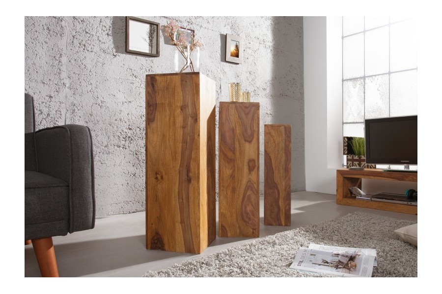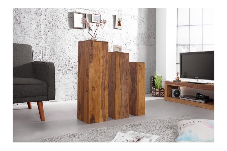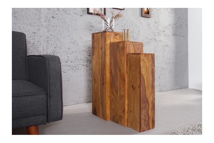 Apportez une touche naturelle et chaleureuse à votre intérieur avec cet ensemble de 3 tables d'appoint gigognes en bois massif Sheesham (Palissandre) naturel. Leur design solide et polyvalent allie style rustique et contemporain, offrant une solution...