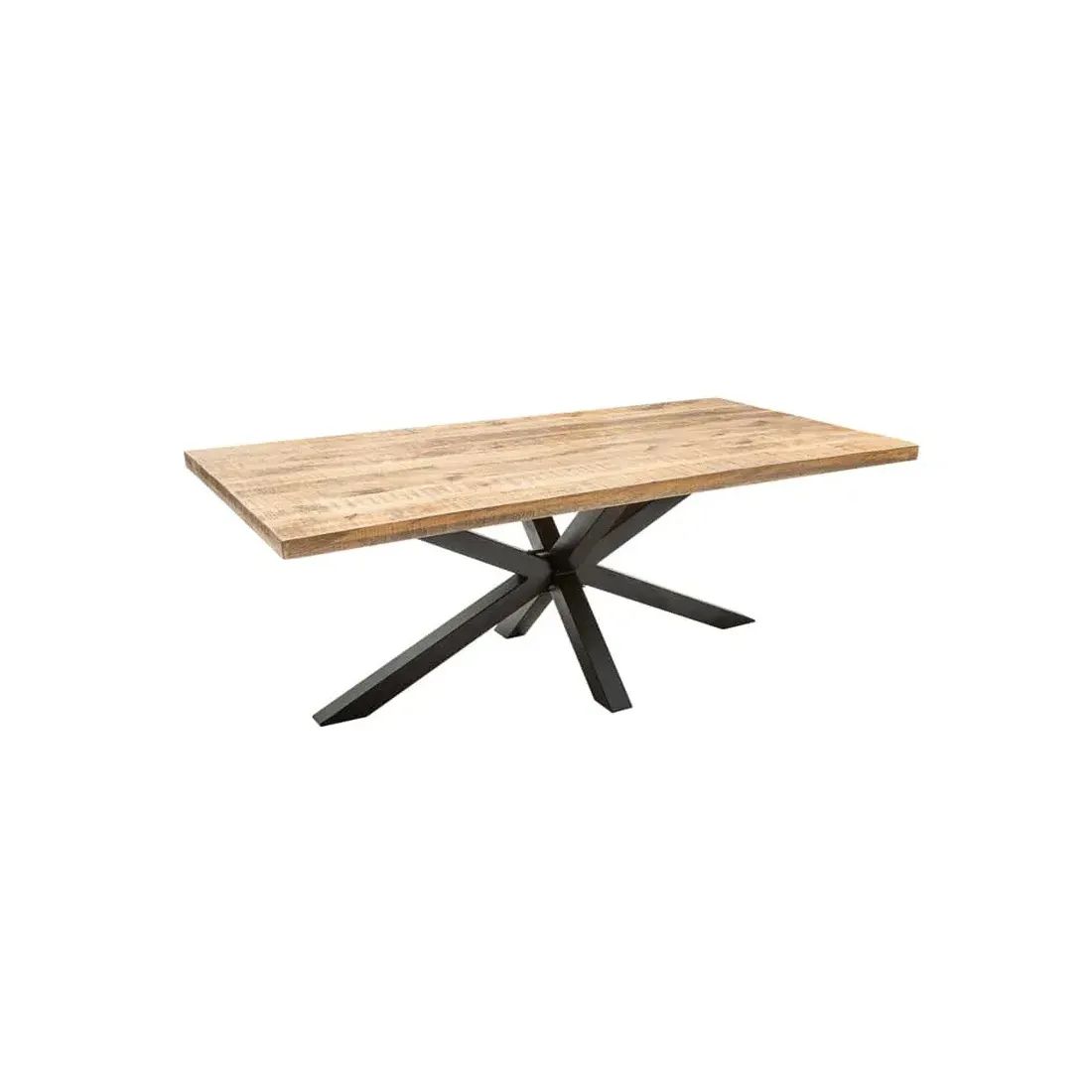 Formidable table à manger de 160 cm avec un design industriel élégant, de forme rectangulaire ! fabriquée soigneusement à la main en bois massif coloris naturel avec piétement en étoile fait en métal solide coloris noir !