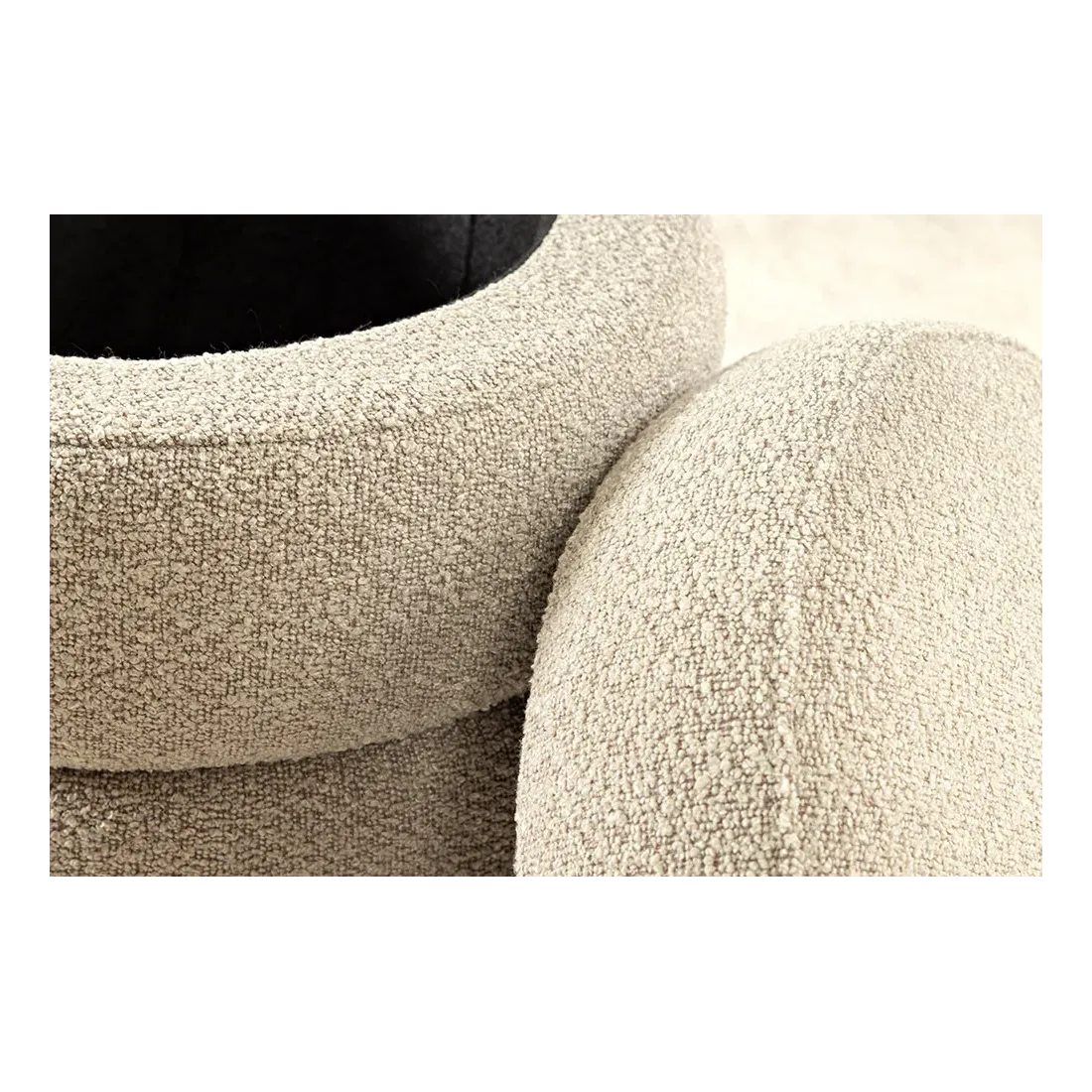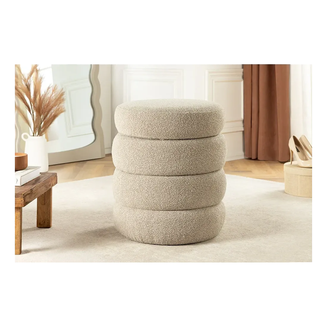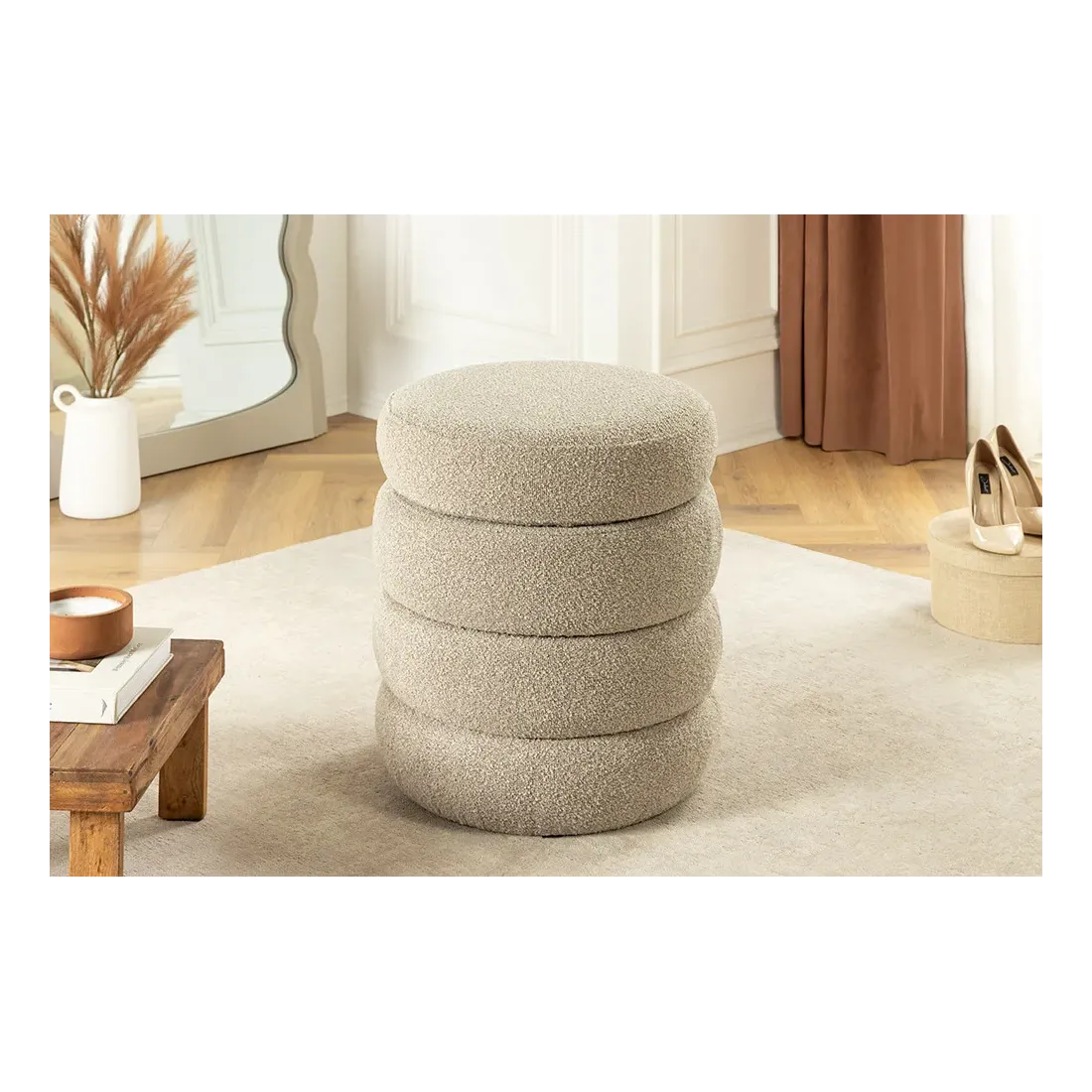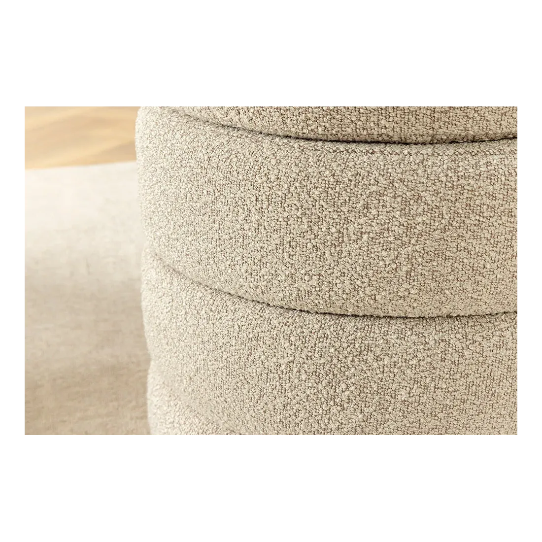 Le tabouret VOGUE combine design contemporain et fonctionnalité intelligente. De forme ronde et revêtu d’un tissu bouclé taupe à la texture douce façon “teddy”, ce pouf séduit par son allure chic et minimaliste.