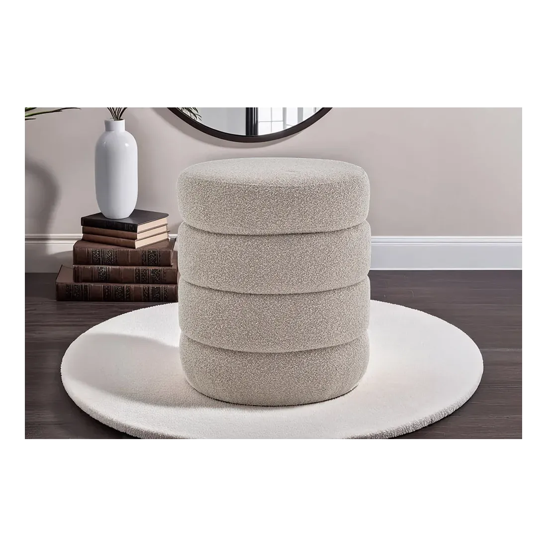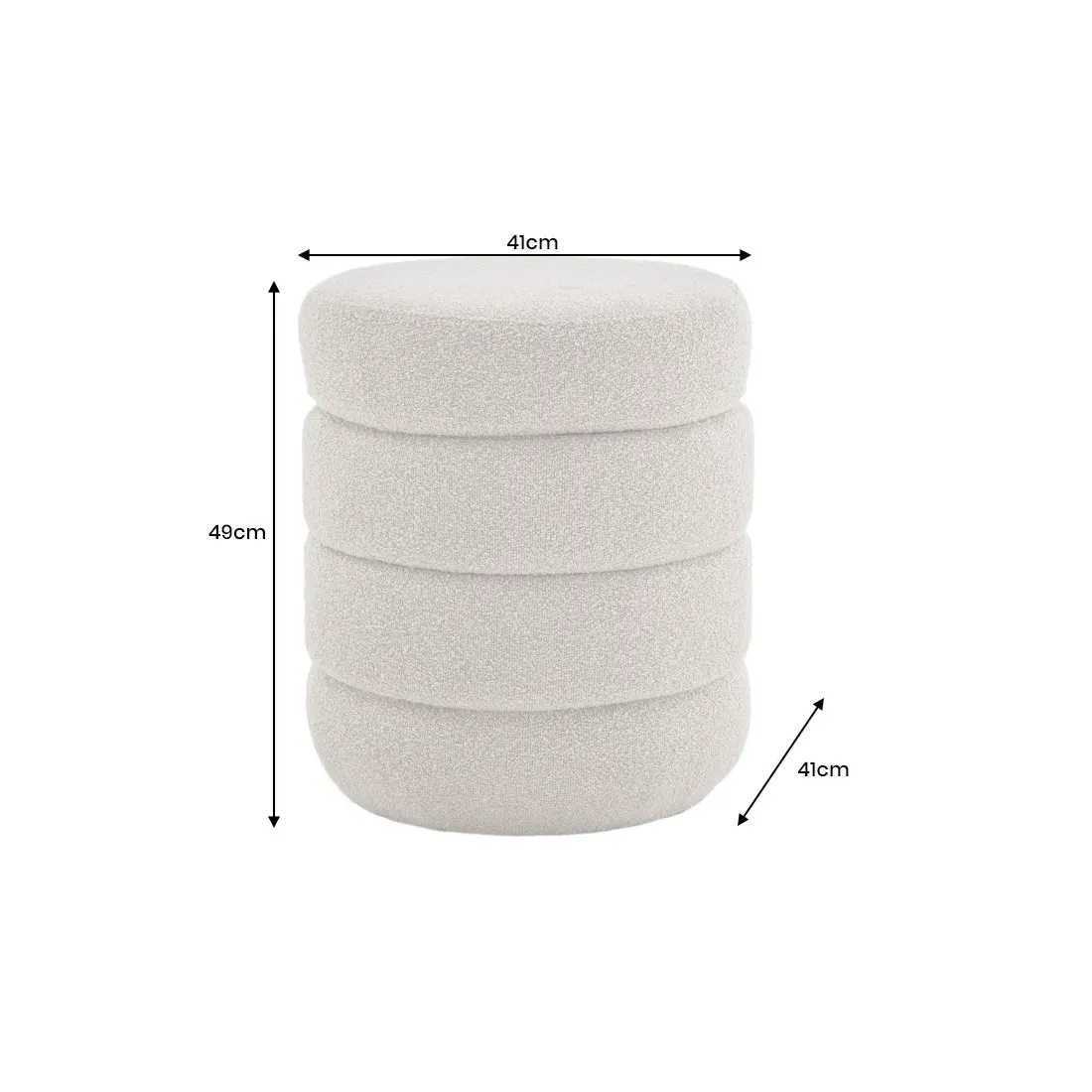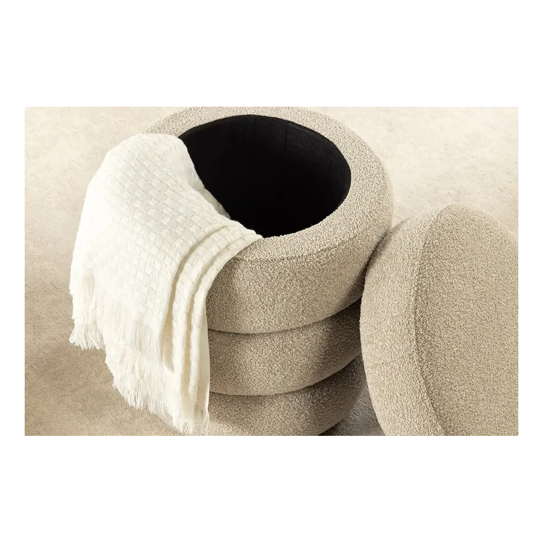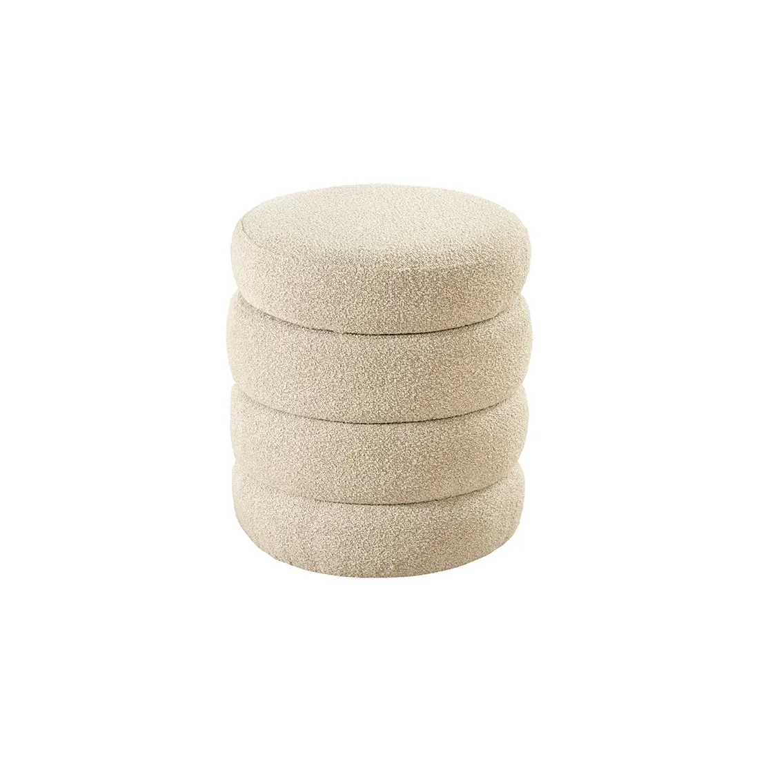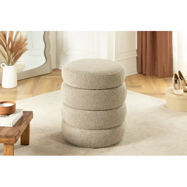 Le tabouret VOGUE combine design contemporain et fonctionnalité intelligente. De forme ronde et revêtu d’un tissu bouclé taupe à la texture douce façon “teddy”, ce pouf séduit par son allure chic et minimaliste.