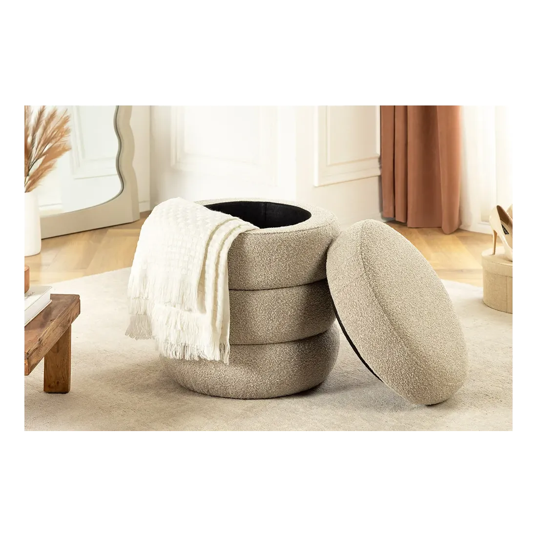 Pouf rond VOGUE en bouclé taupe – 50 cm – Siège confortable avec espace de rangement intégré