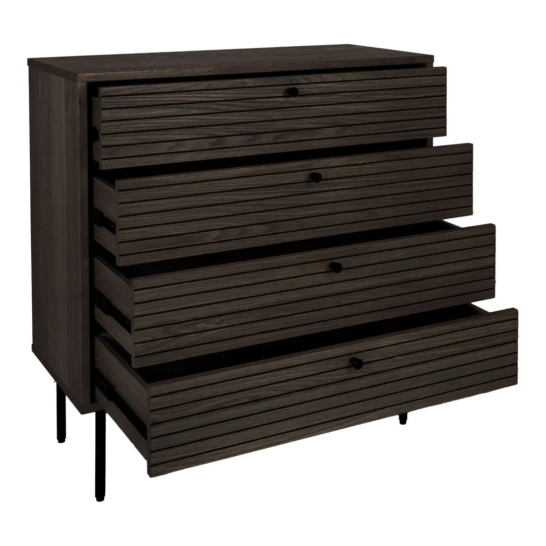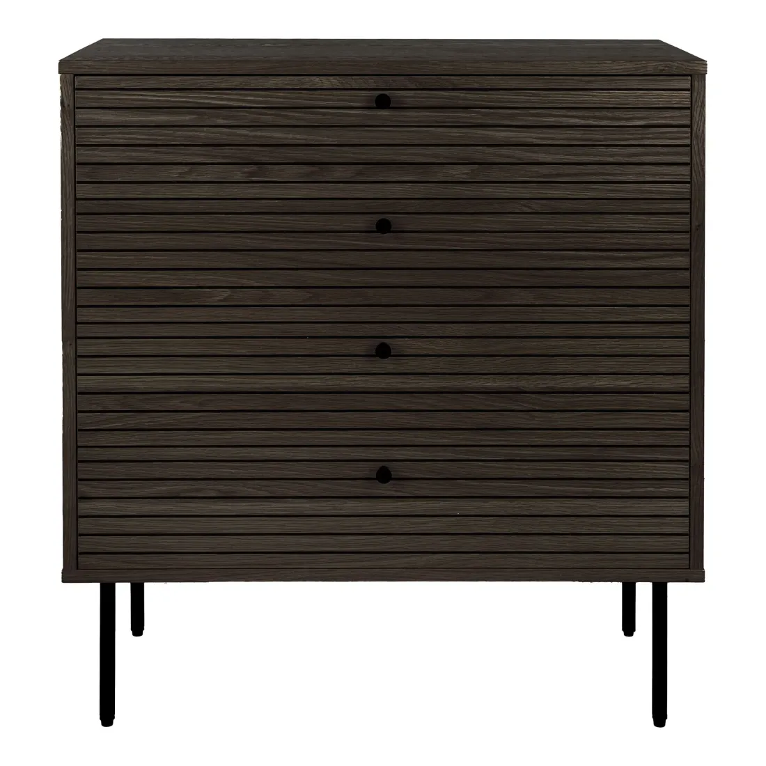 Apportez caractère et fonctionnalité à votre intérieur avec cette commode 4 tiroirs en placage chêne fumé. Son coloris profond et chaleureux s’associe parfaitement à ses pieds en acier noir pour un style moderne aux accents industriels.